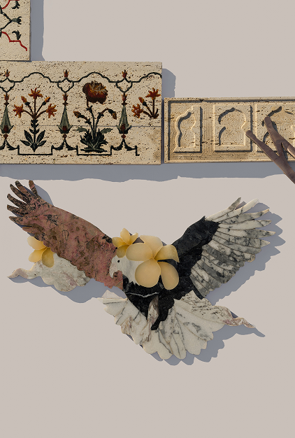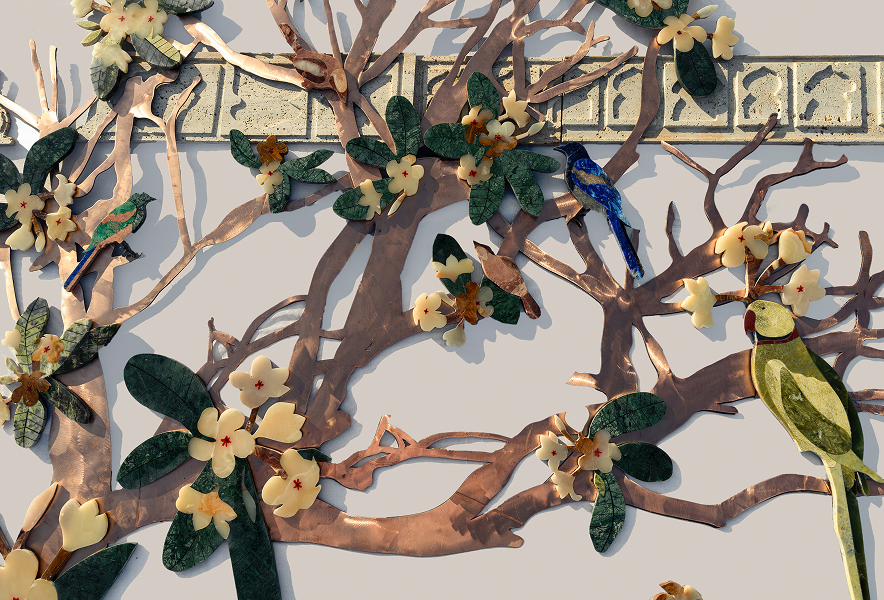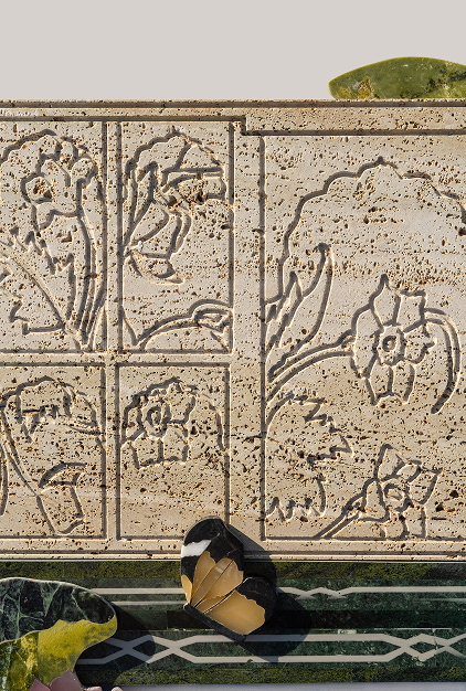 99 Butterflies, a deeply personal work by Asad, explores the experience of displacement through intricate stone butterflies, each one a symbol of resilience and renewal. Inspired by the words of Palestinian poet Mahmoud Darwish – “Where will we go after the last frontiers? Where will the birds fly after the last sky?”– the installation gives form to the search for belonging, mirroring the fate of those uprooted by conflict.